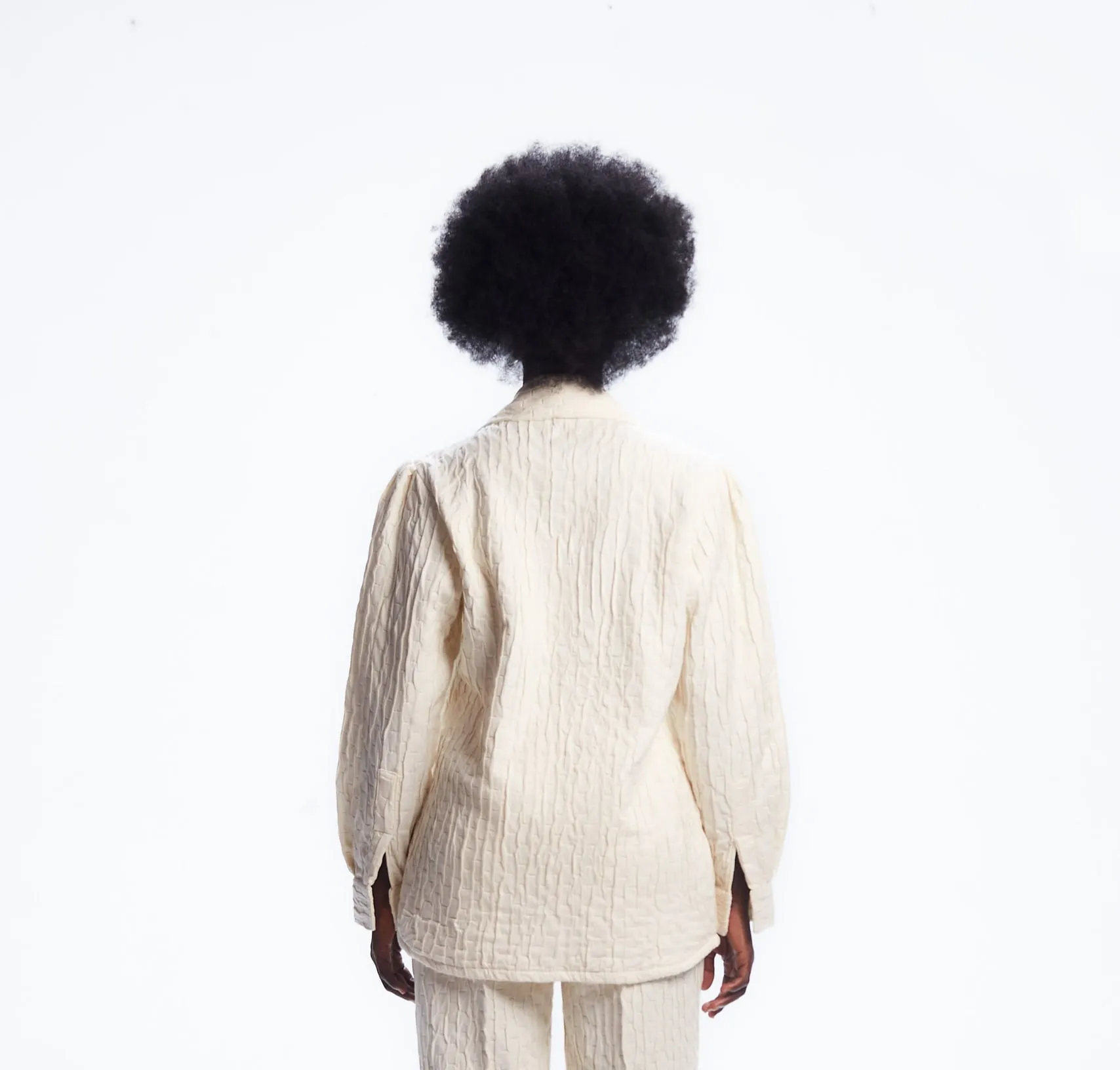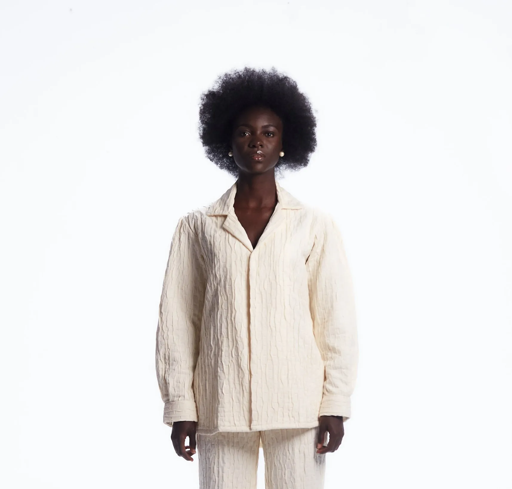 Experience the perfect blend of style and functionality with the AJABENG Ohenewa Textured Lapel Shirt. Crafted with attention to detail and featuring a strong button, this shirt is designed for your convenience without compromising on elegance. Made from a luxurious textured wool cotton blend, this shirt not only offers comfort but also exudes a unique and tactile quality. The blend of wool and cotton ensures that you stay cozy and stylish throughout the day, making it an excellent choice for various occasions.