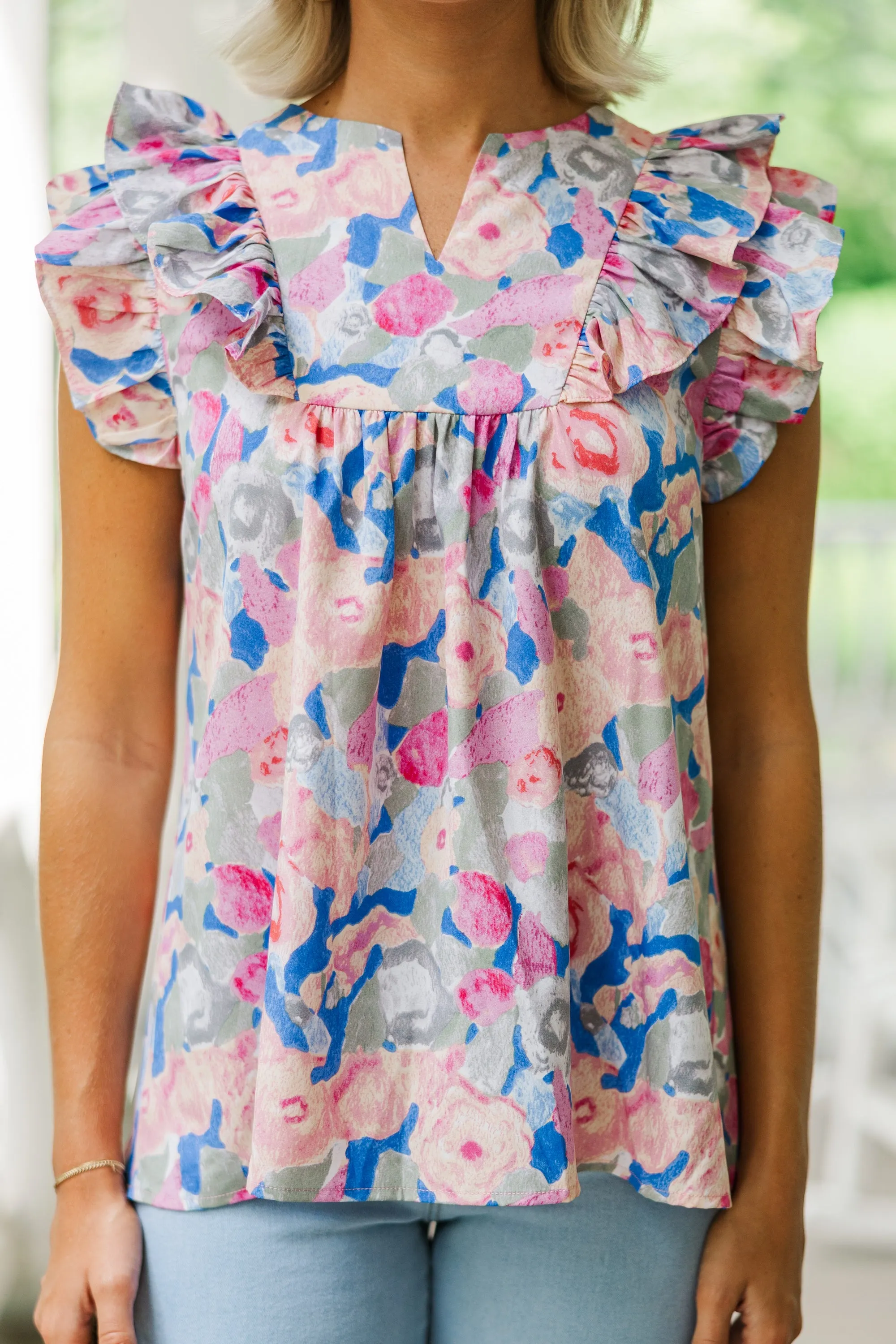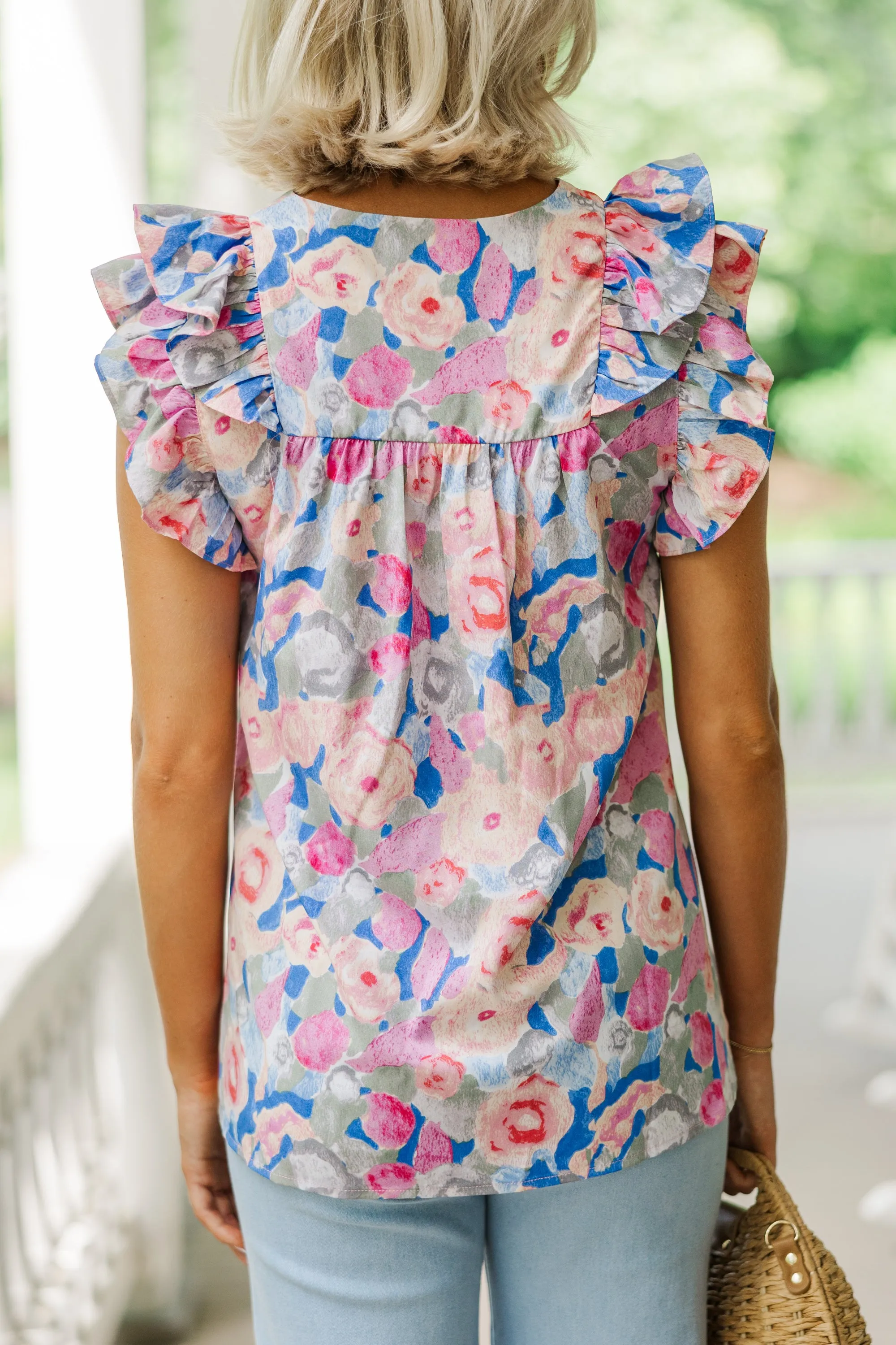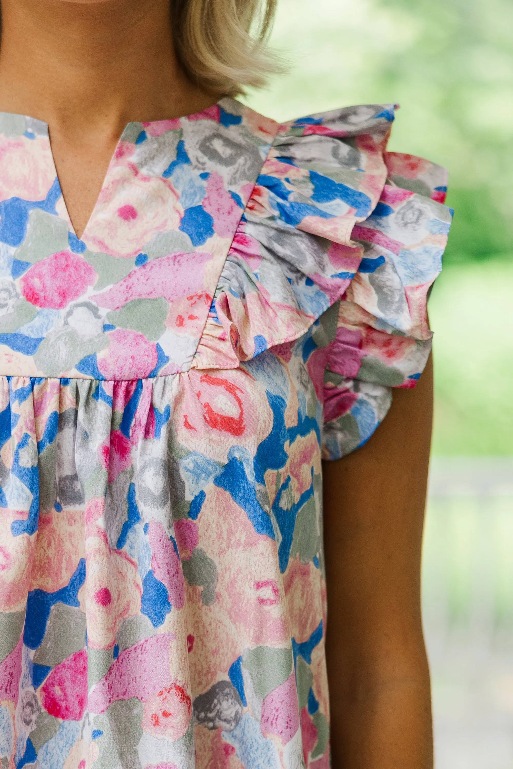 Brighten up your wardrobe with this pink floral blouse featuring adorable ruffled cap sleeves! This versatile piece can be paired with jeans or shorts for a casual look, or with trousers for a polished work ensemble. The soft floral pattern adds a touch of femininity, making it perfect for any occasion. You'll love how effortlessly chic and comfortable this blouse is for both work and play!
