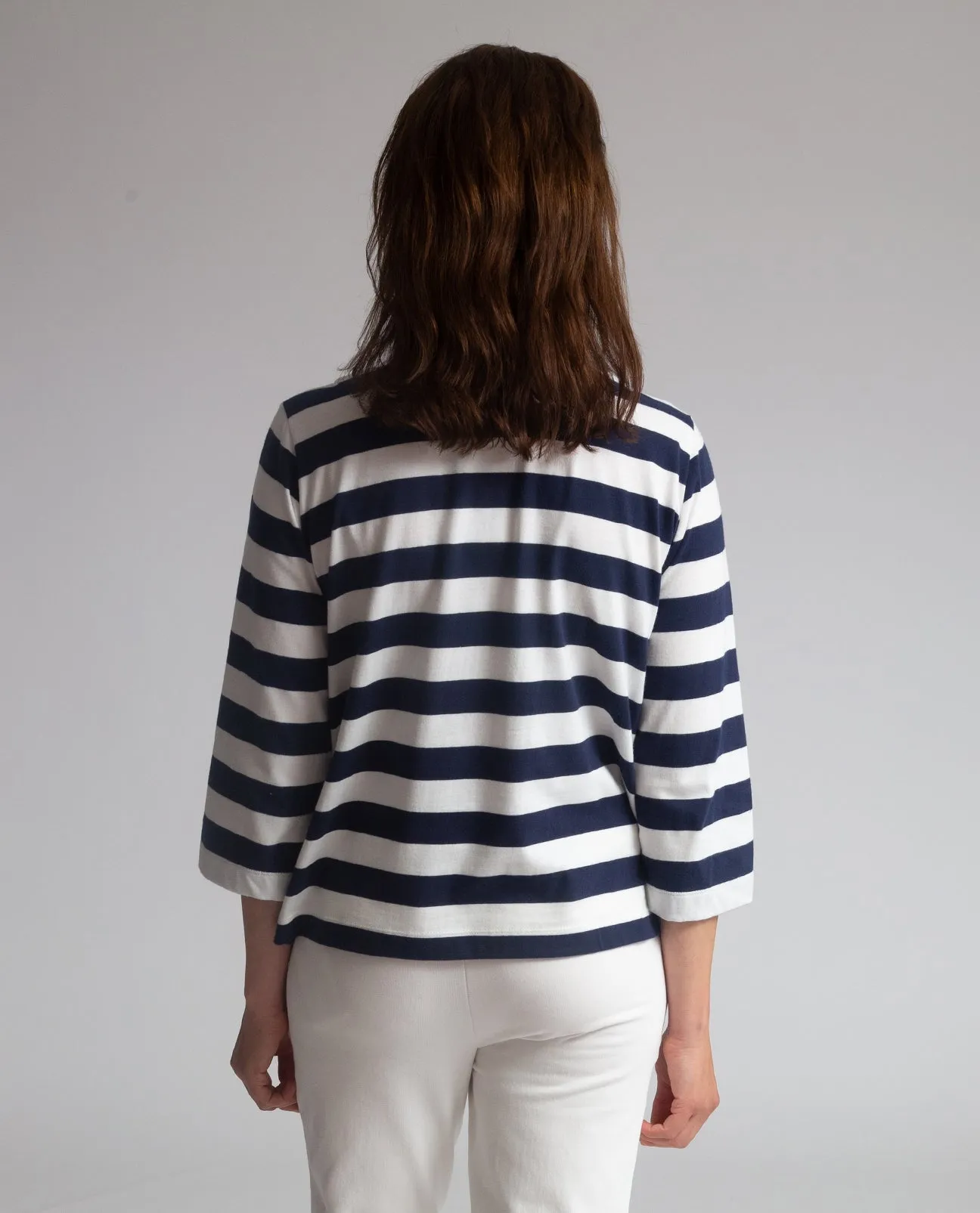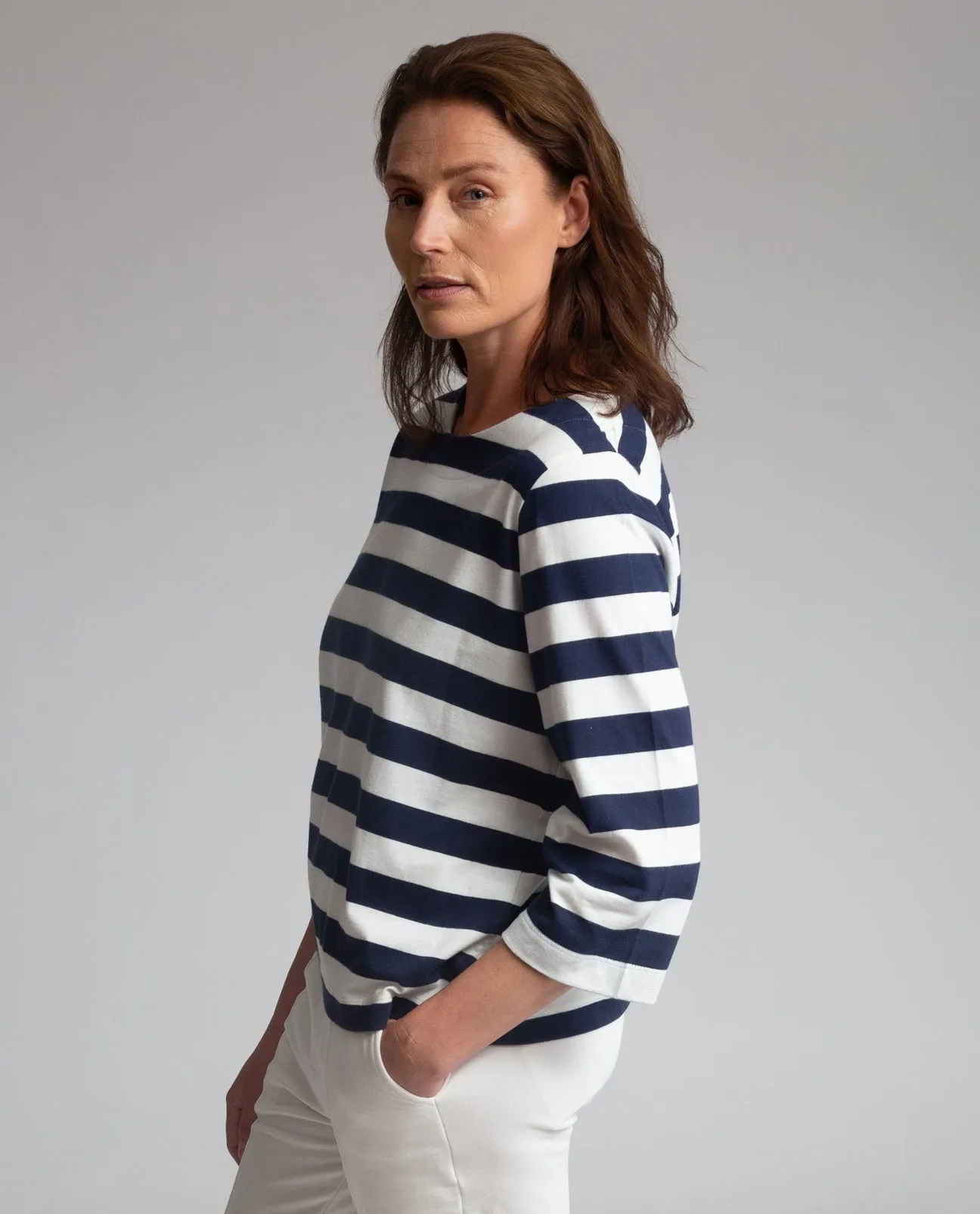 Featuring a boat neckline and boxy cut, it is a very flattering take on a modern Breton top.