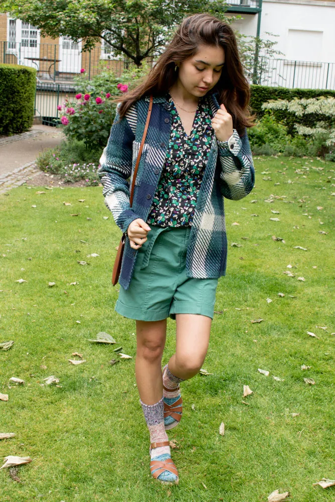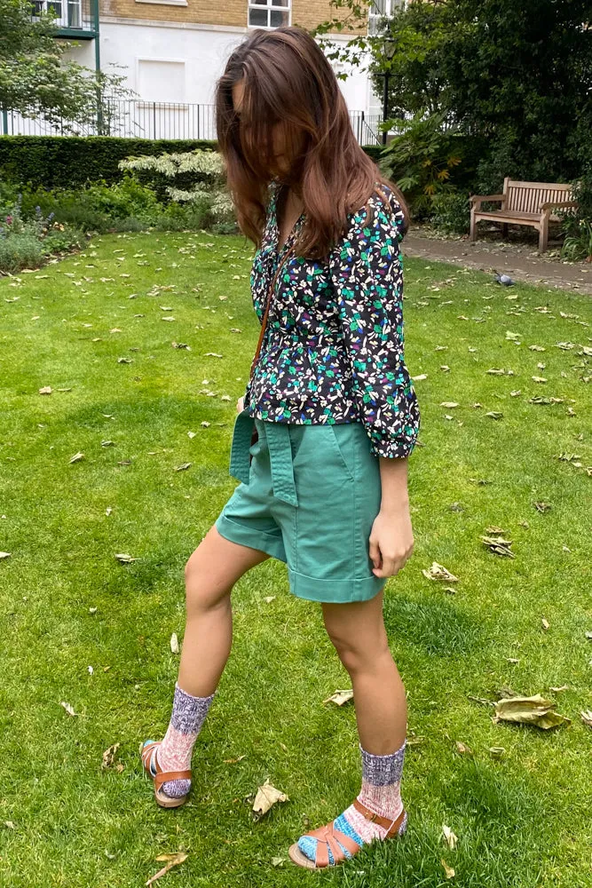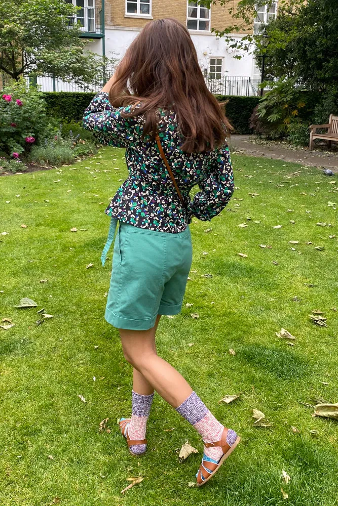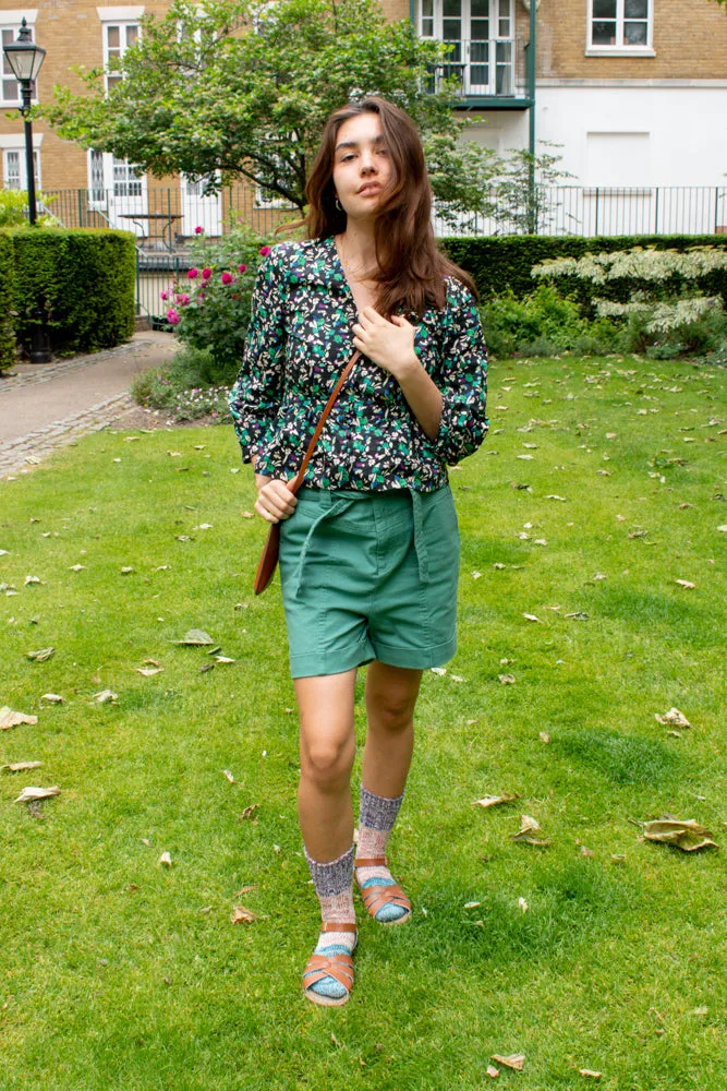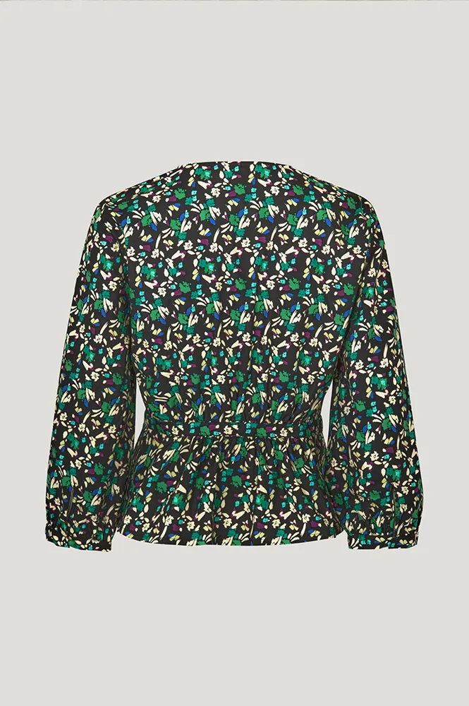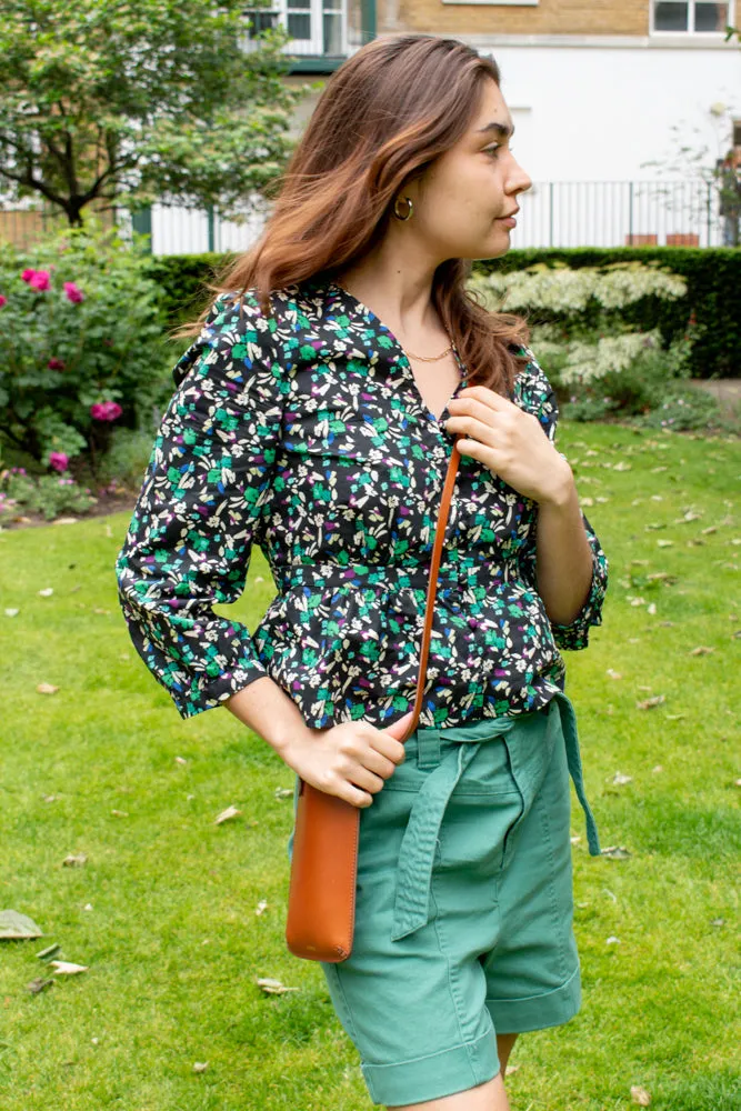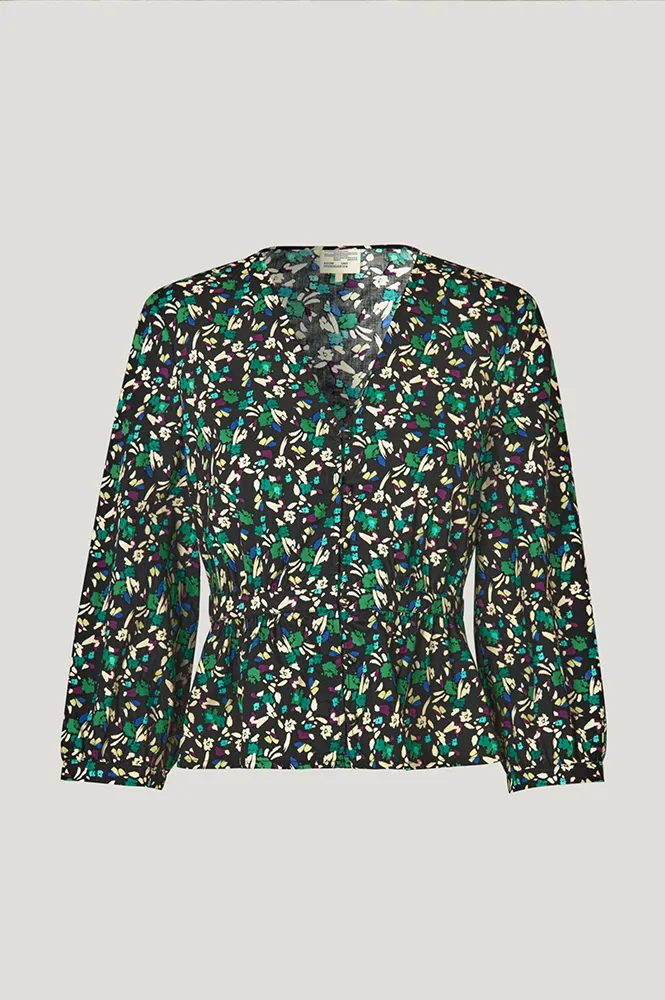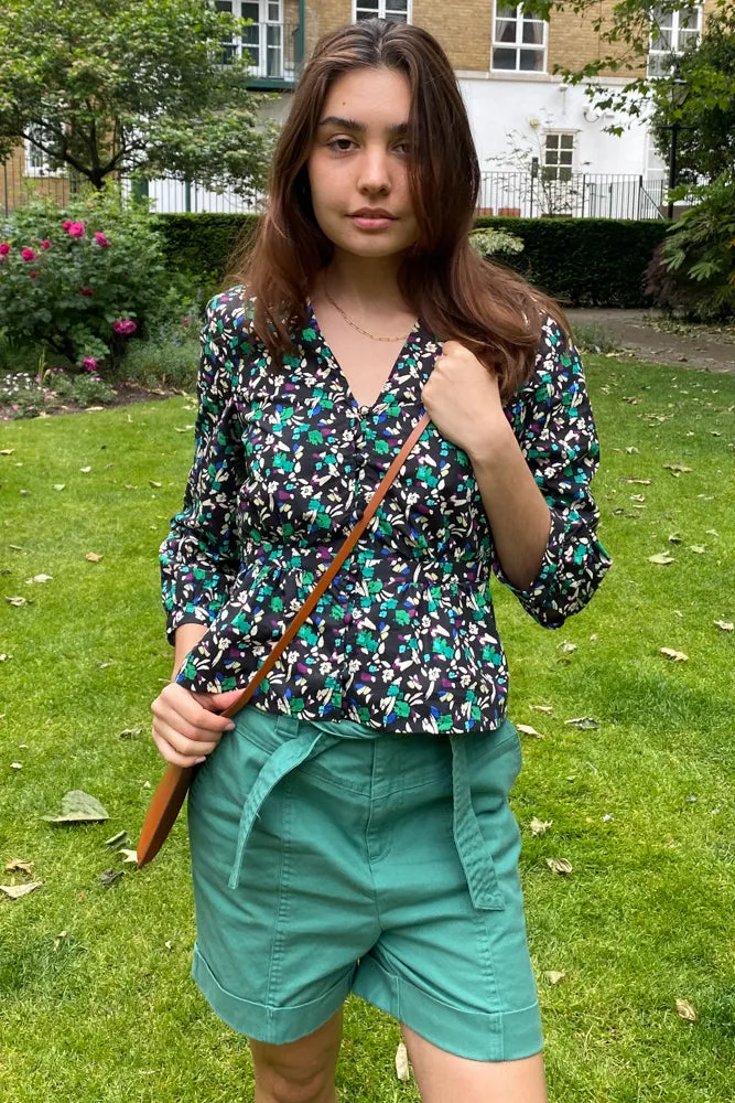 A cropped, peplum-style top with fabric-covered button closures in the front and a nipped-in waist. There is a V-neckline.