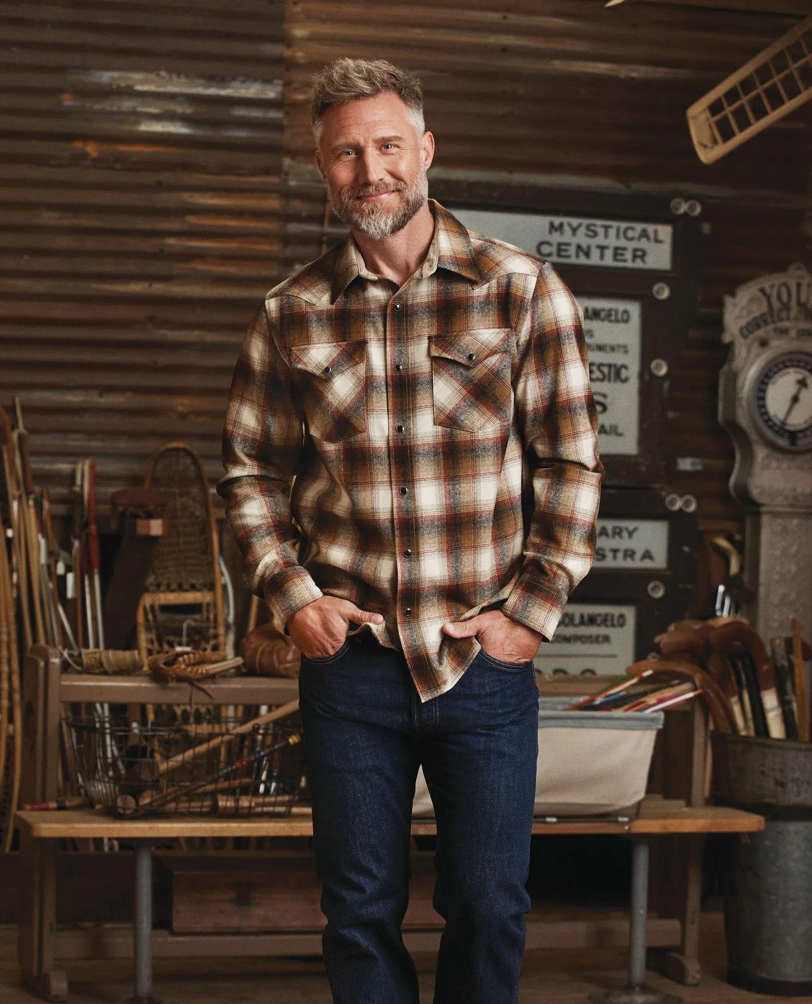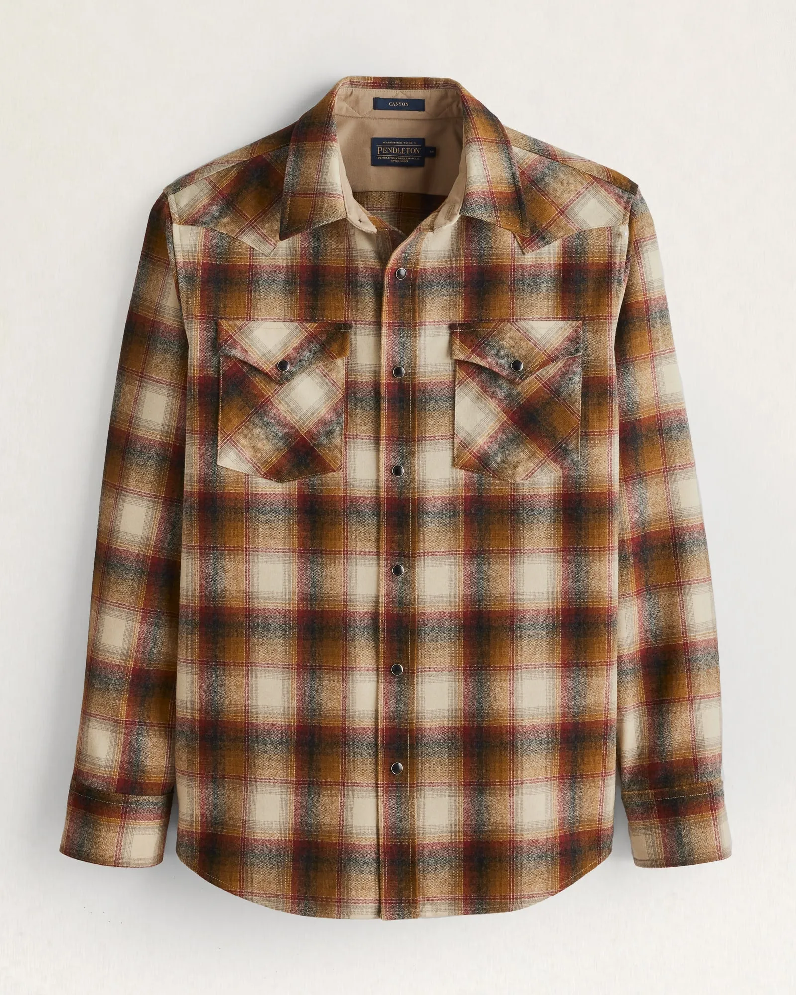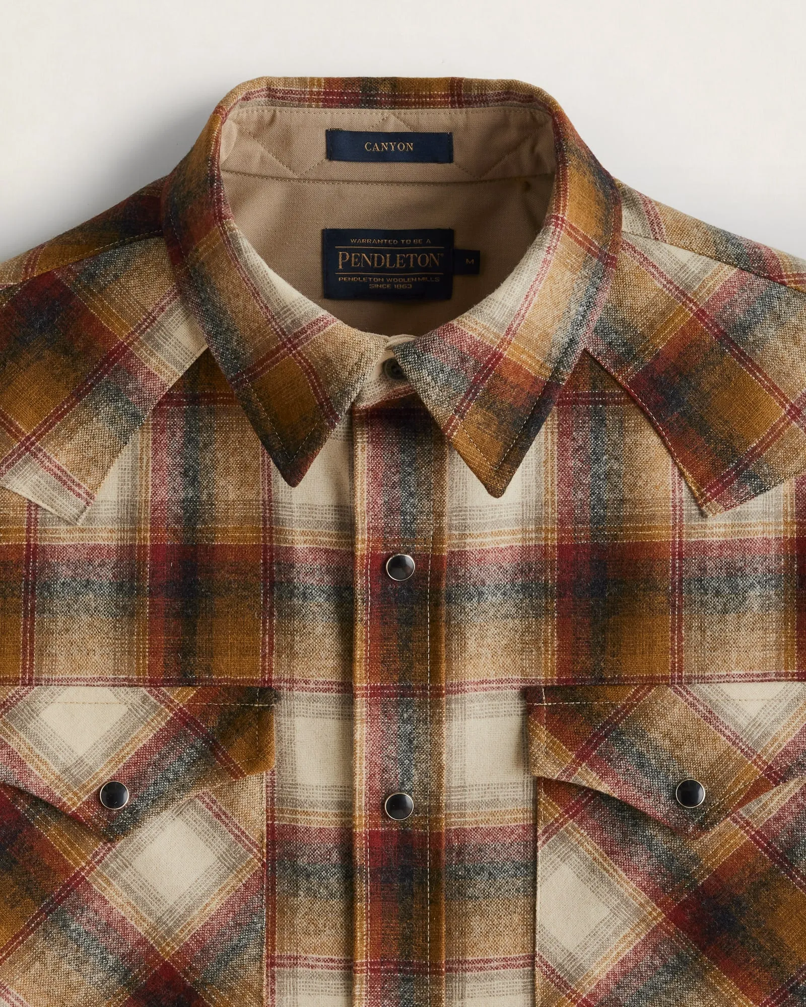 Our Canyon Western Wool Plaid Shirt by Pendleton is a western classic from the 1983 archives. These shirts are made from pure Umatilla wool, sourced from Oregon ranchers, and woven in American mills. Designed with classic details: pearlized snaps, peaked yokes and two flapped, button-through chest pockets. Tall fits men 6' and up.