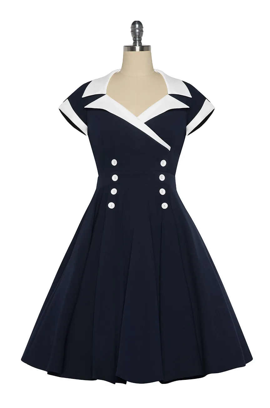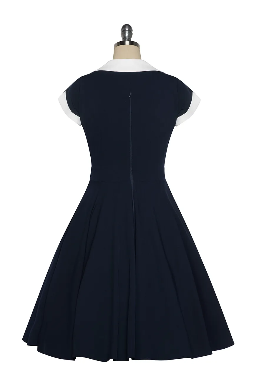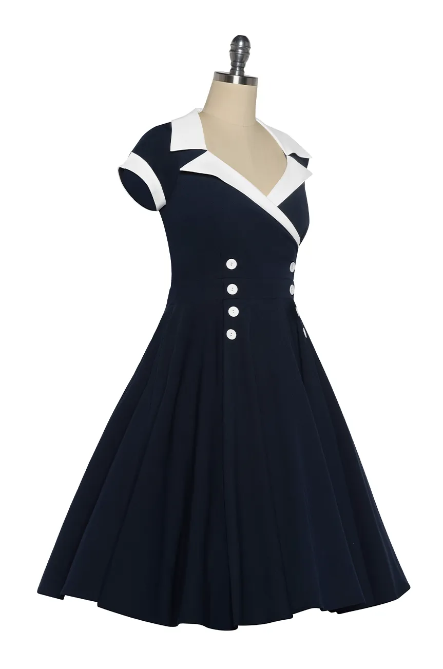 Created in a beautiful navy blue, which is set off perfectly with a white collar, this unique vintage dress features 8 matching white buttons that define the waist and complement the gorgeous V-shaped Collar neckline.