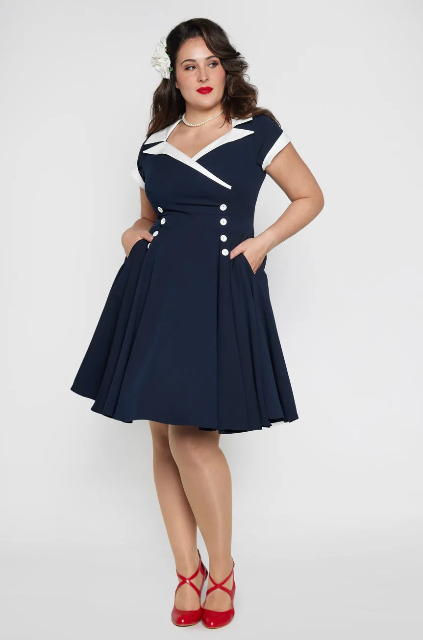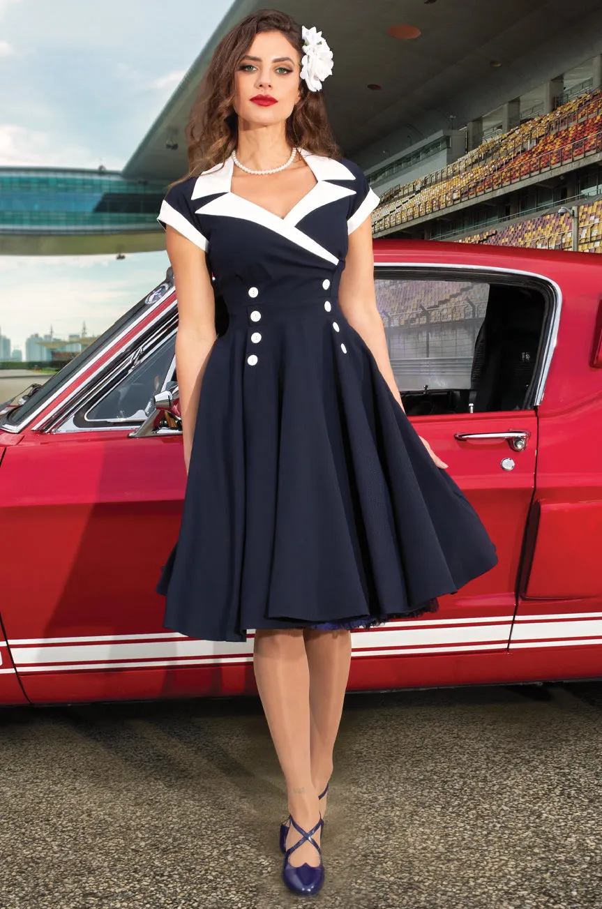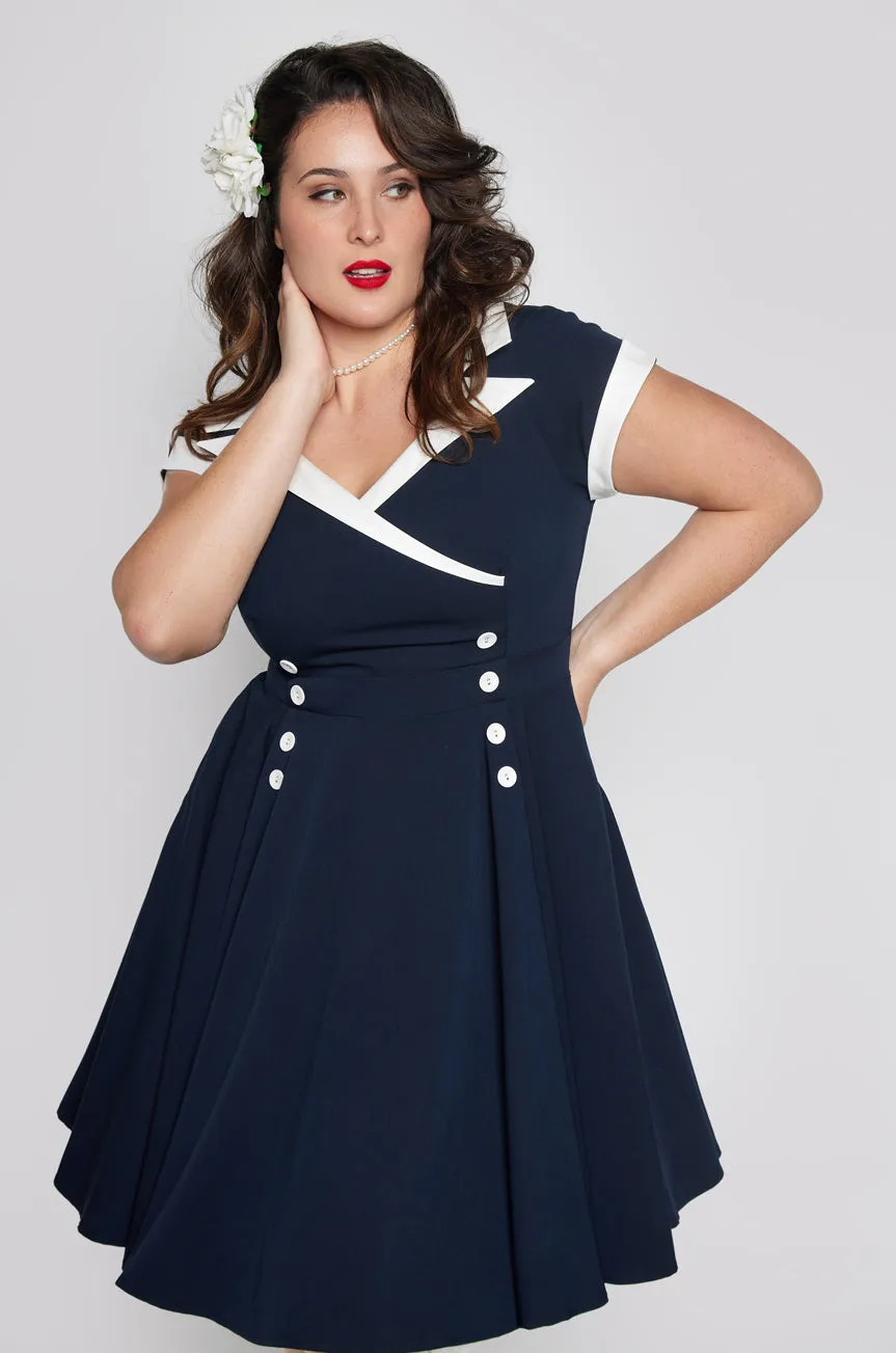 Created in a beautiful navy blue, which is set off perfectly with a white collar, this unique vintage dress features 8 matching white buttons that define the waist and complement the gorgeous V-shaped Collar neckline.