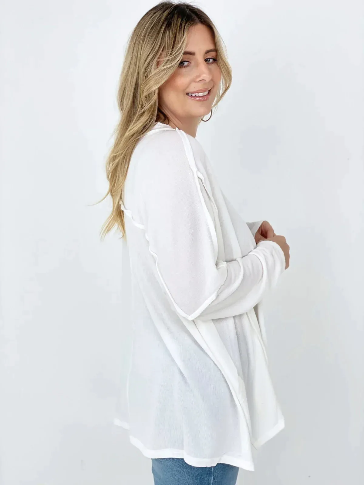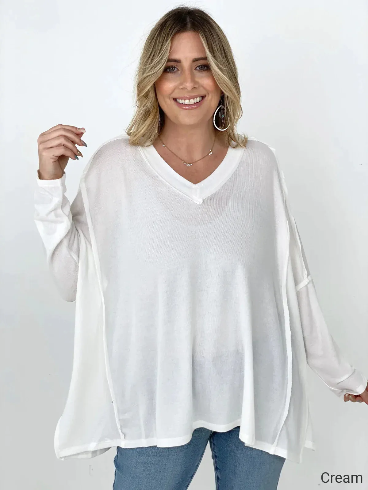 The easy breezy V-Neck top is the perfect comfy wardrobe essential. This lightweight top is made of a light and stretchy knit fabric that is perfect for all weather. The relaxed sleeves provide a comfy fit, while the distressed seem and side slits adds a touch of style. Wear it with denim and a bootie for a warm casual look and pair with shorts and a sandal as Spring approaches. This top is sure to keep you comfy every time you wear it.