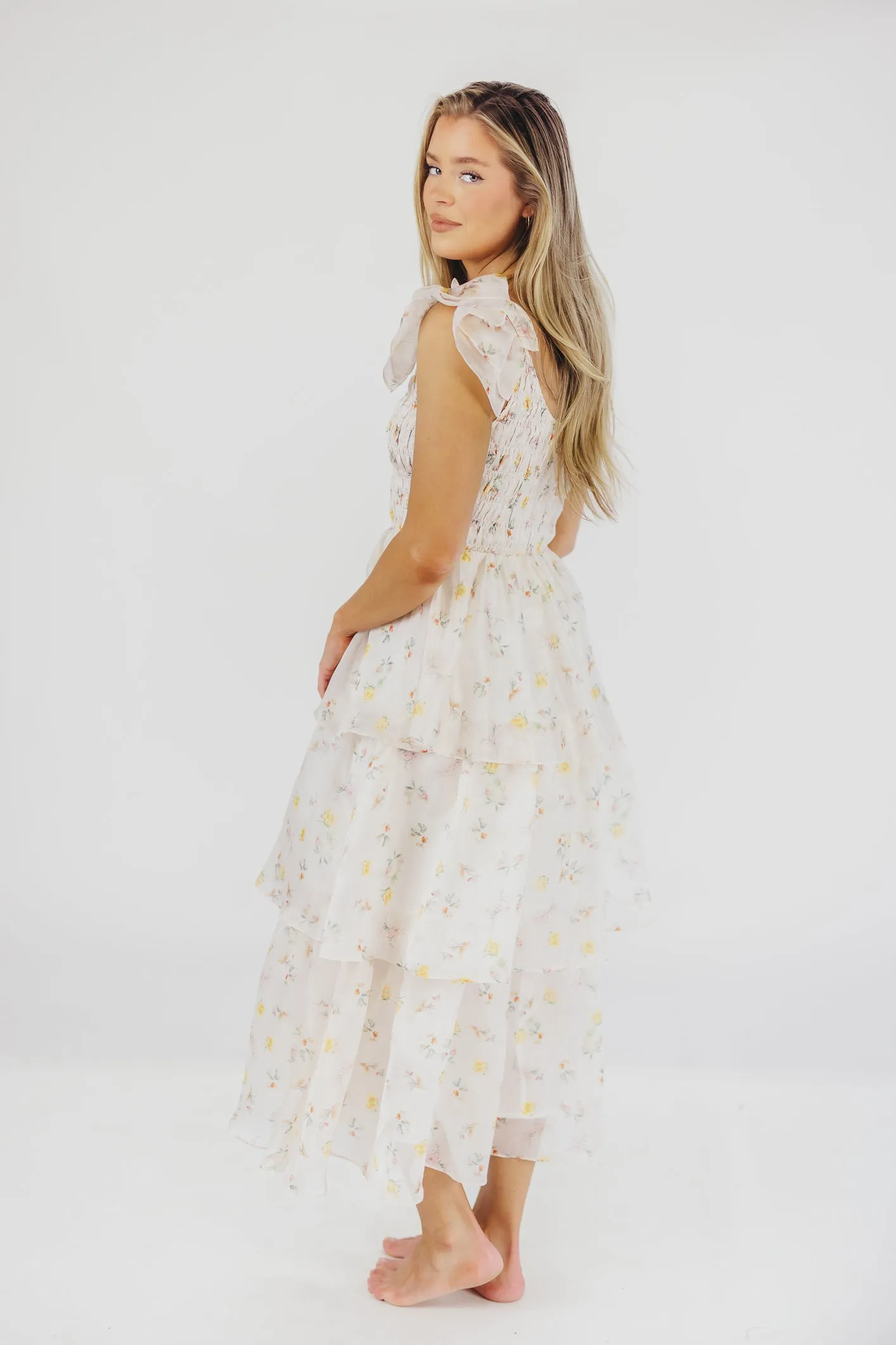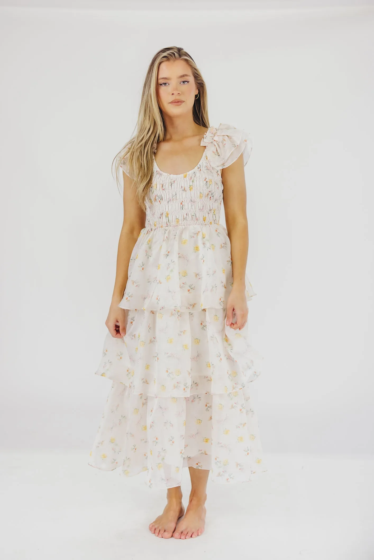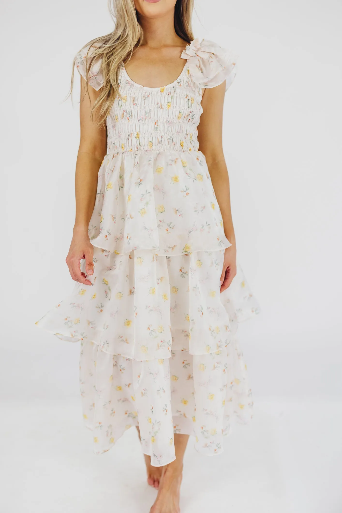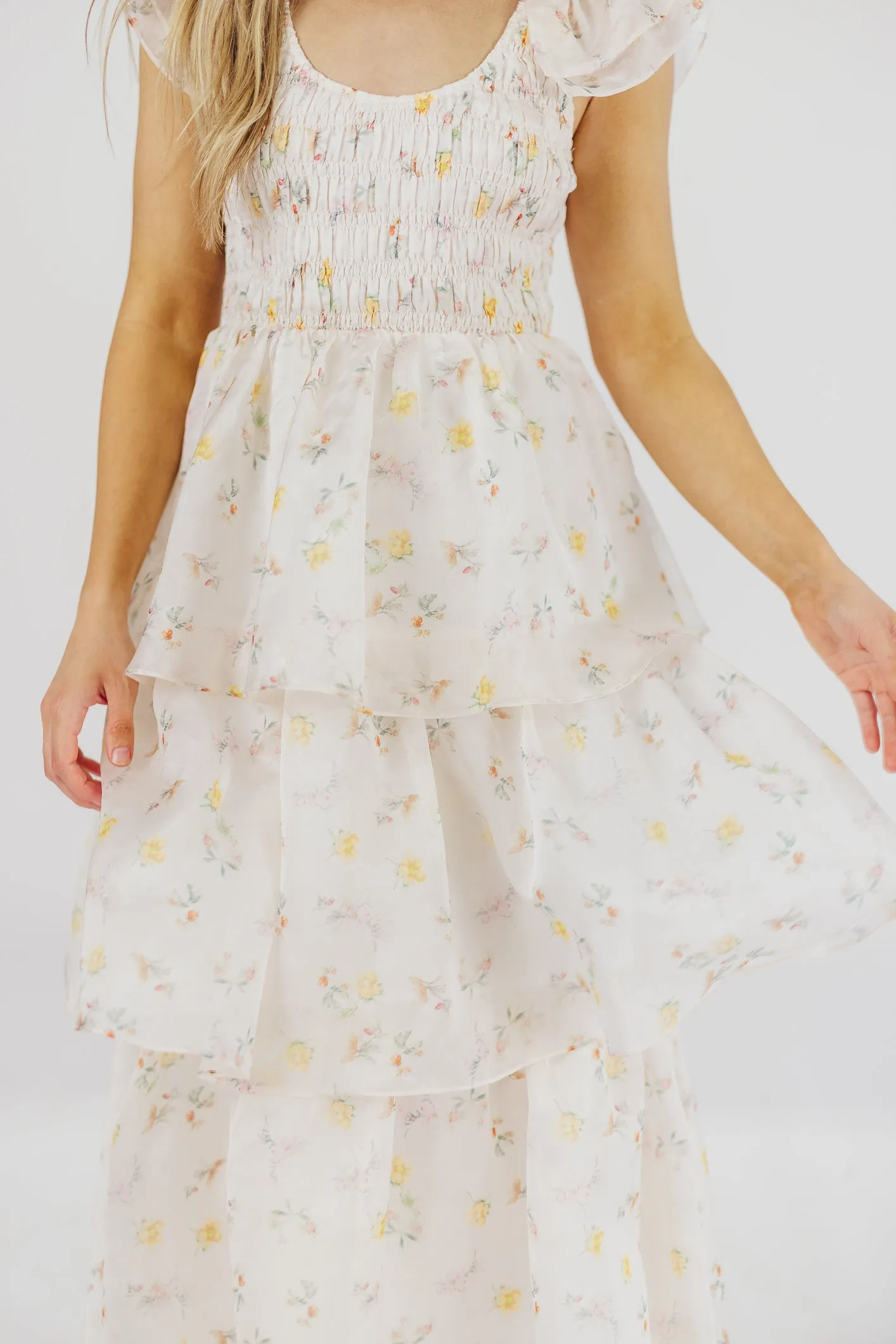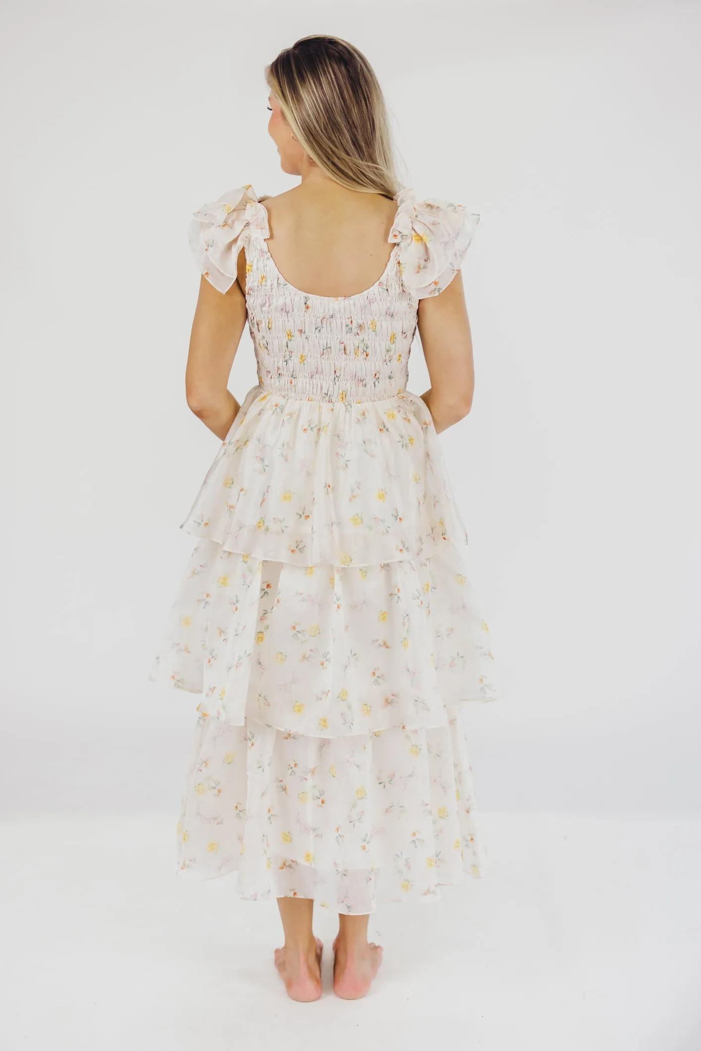 GARMENT DETAILS: Lightweight, floral-print organza dress in a long midi length. Bodice features a scooped neckline, with front and back smocking and ruffled cap sleeves. Skirt features full, ruffled tiers with lining.