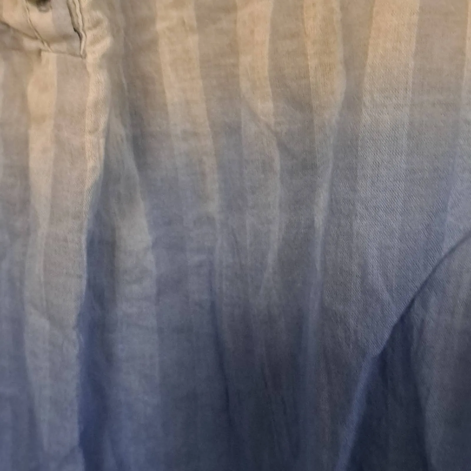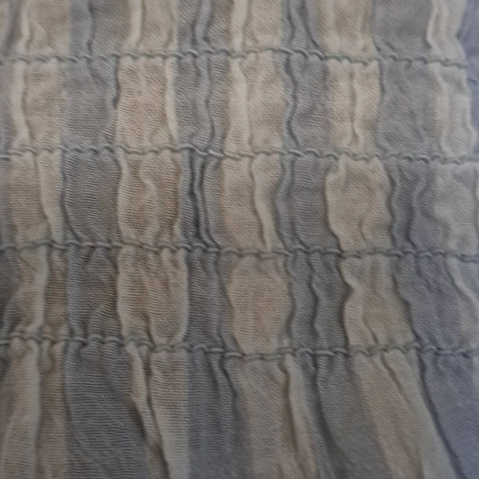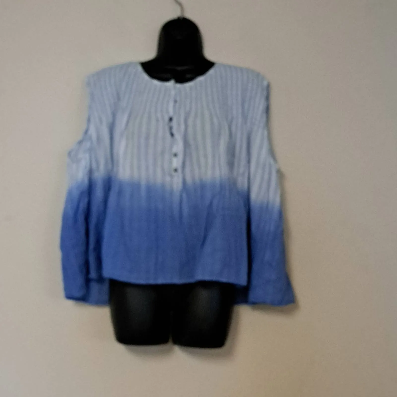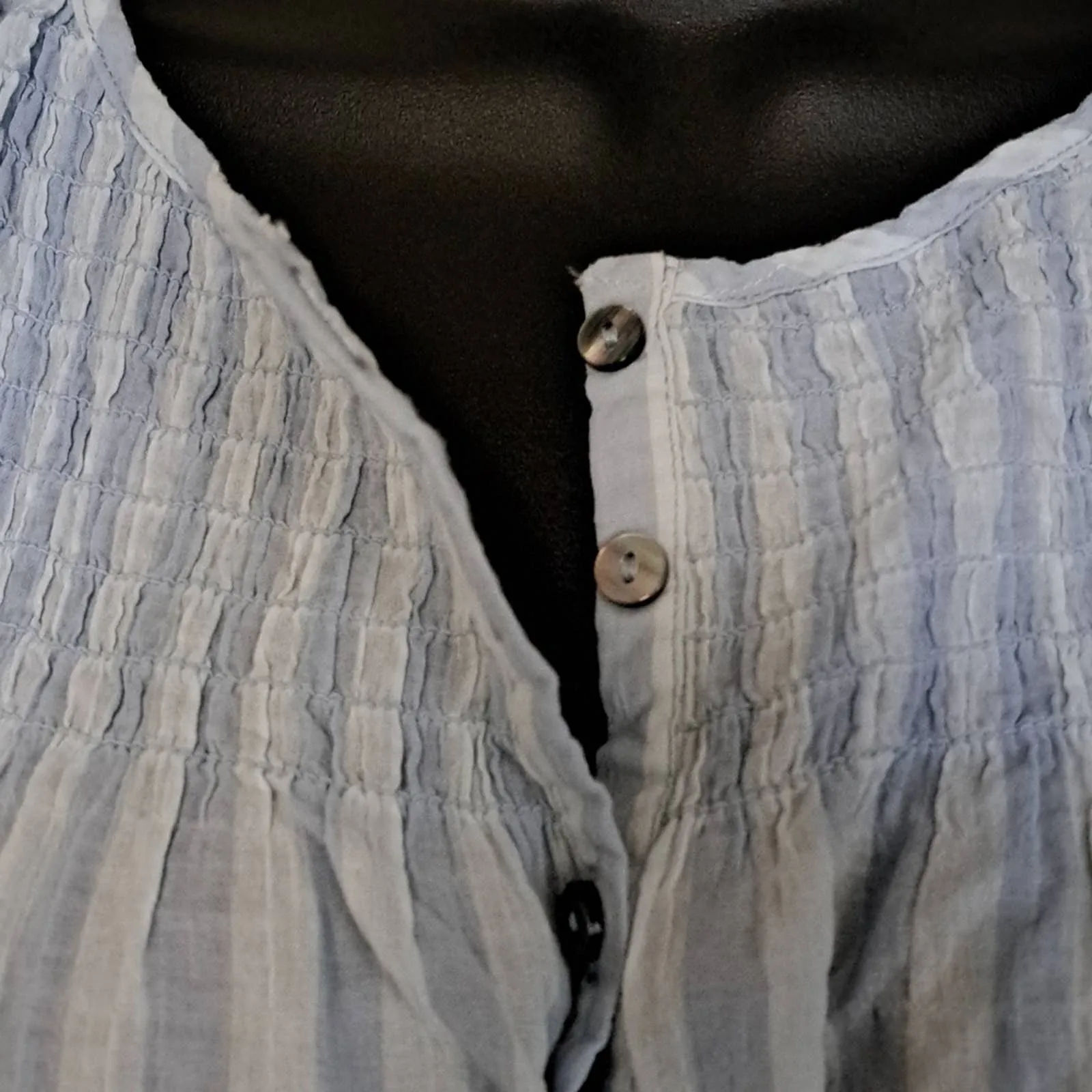 Smocked top and shoulders, Crew neck, Cap sleeves, Partial front button closure. Ombre pattern
