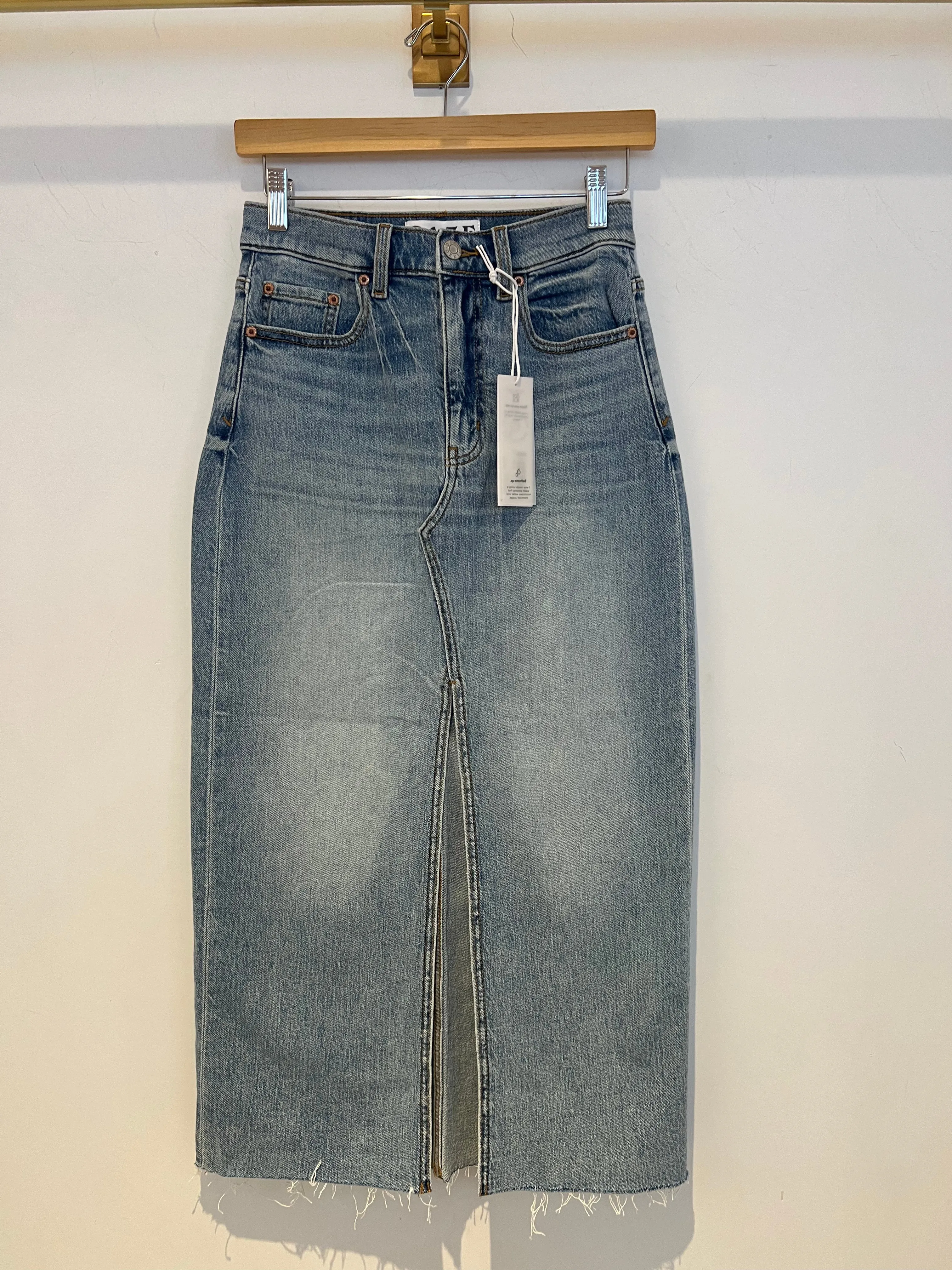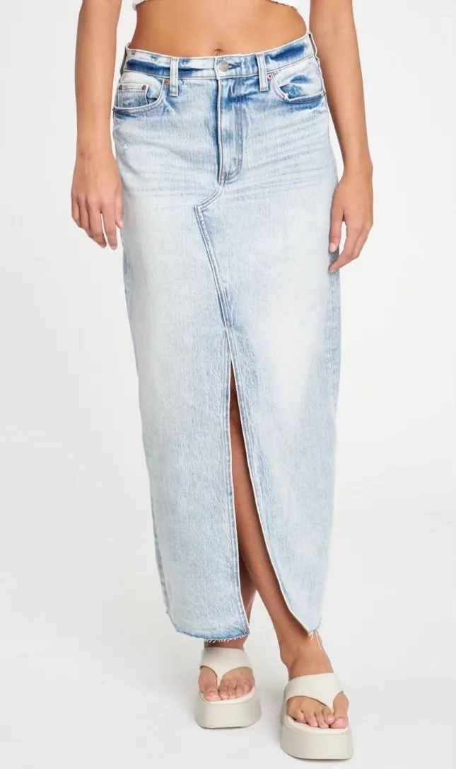 Step up your denim game with the Girl Next Door Skirt! This ankle length skirt features unique off center front crease detailing and a light wash with highs and lows for added edge. Made from our Tough Love fabric, it's rigid yet conforms to your body for the perfect fit. Plus, with organic cotton, it's a sustainable and stylish choice.