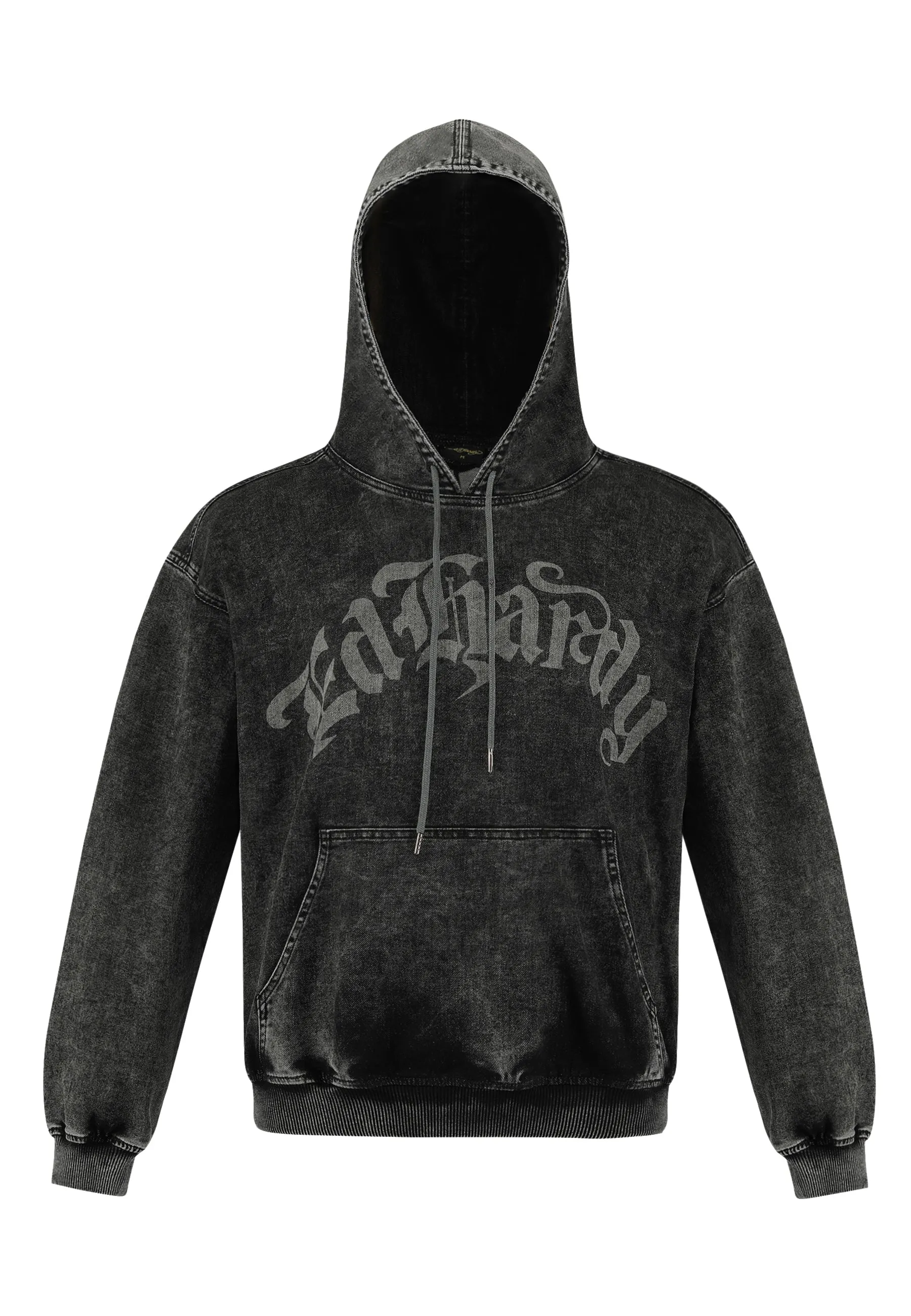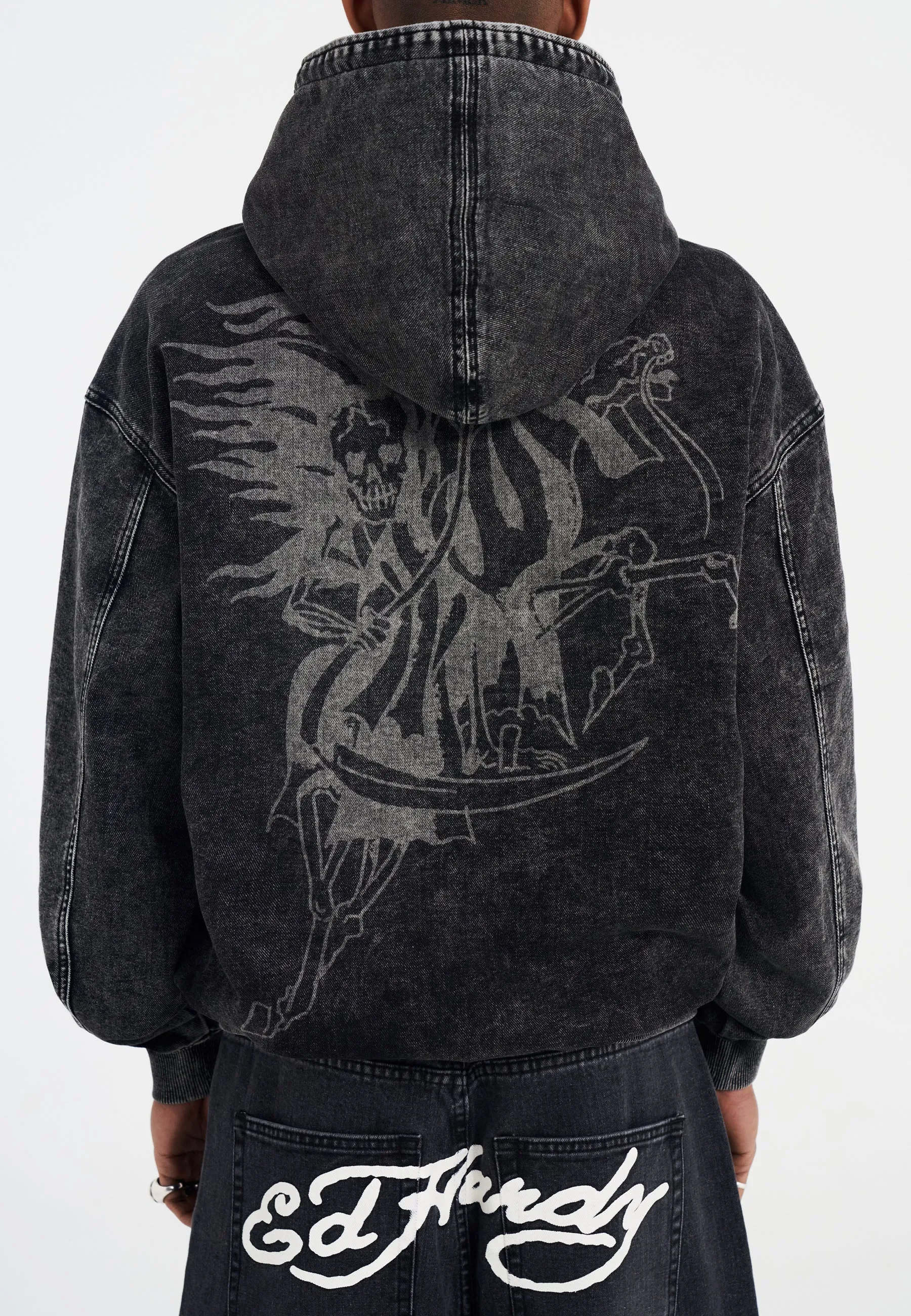 Introducing the Men's Death Rider Denim Pouch Hoodie, bold, oversized and heavily distressed for AW.