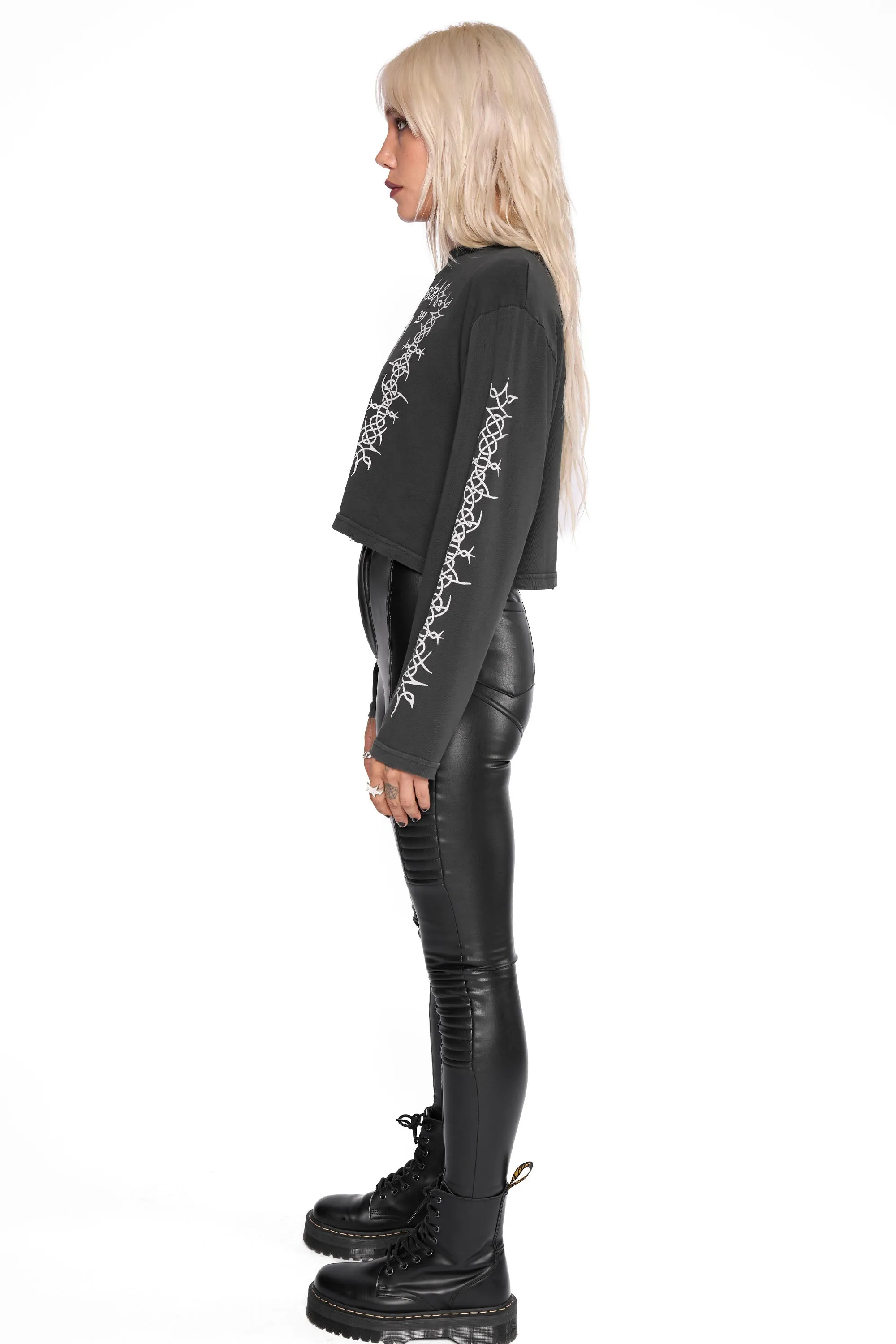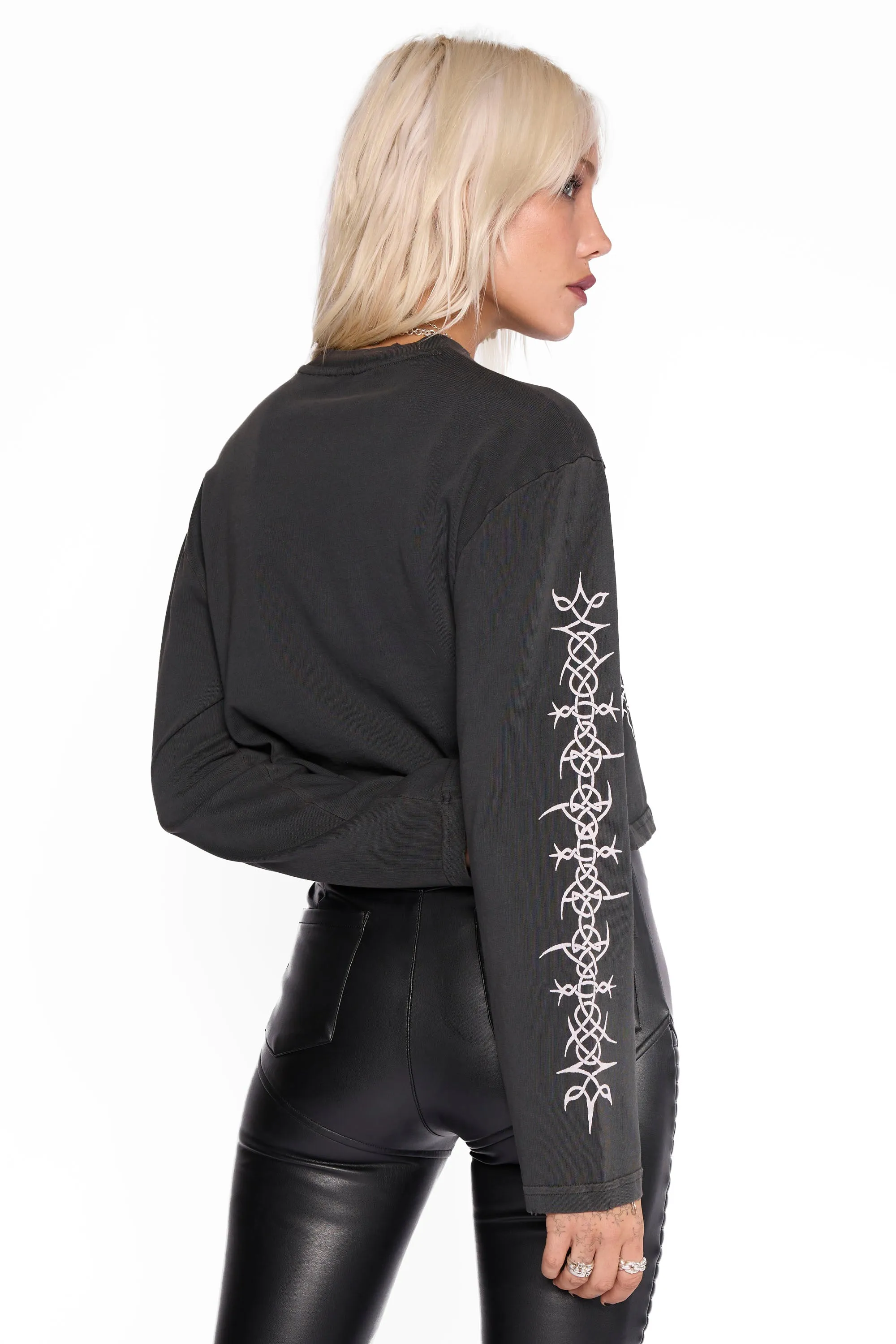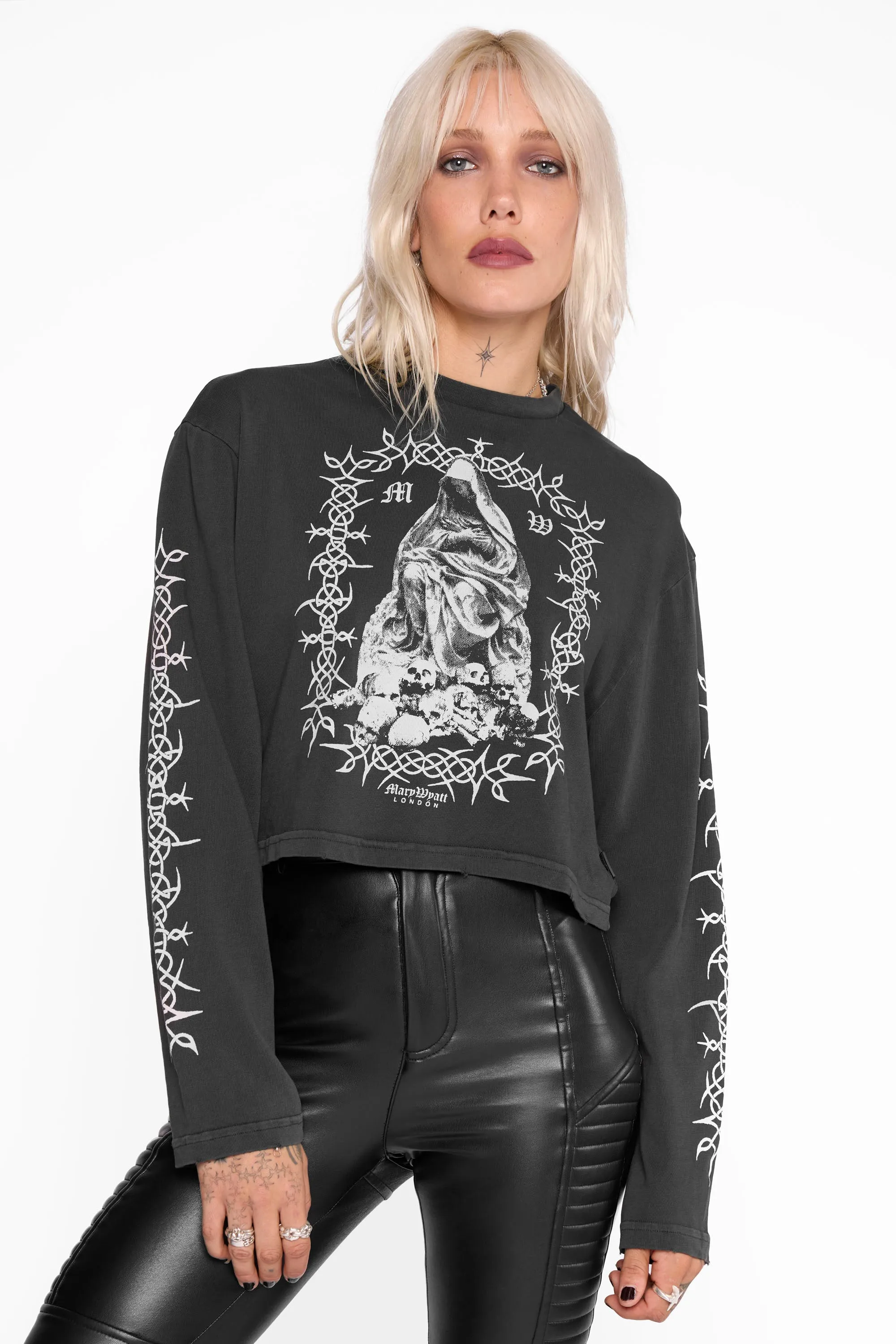 Made from soft, vintage-washed jersey fabric, it has a cropped fit, long sleeves, and an embossed MW label on the side seam.