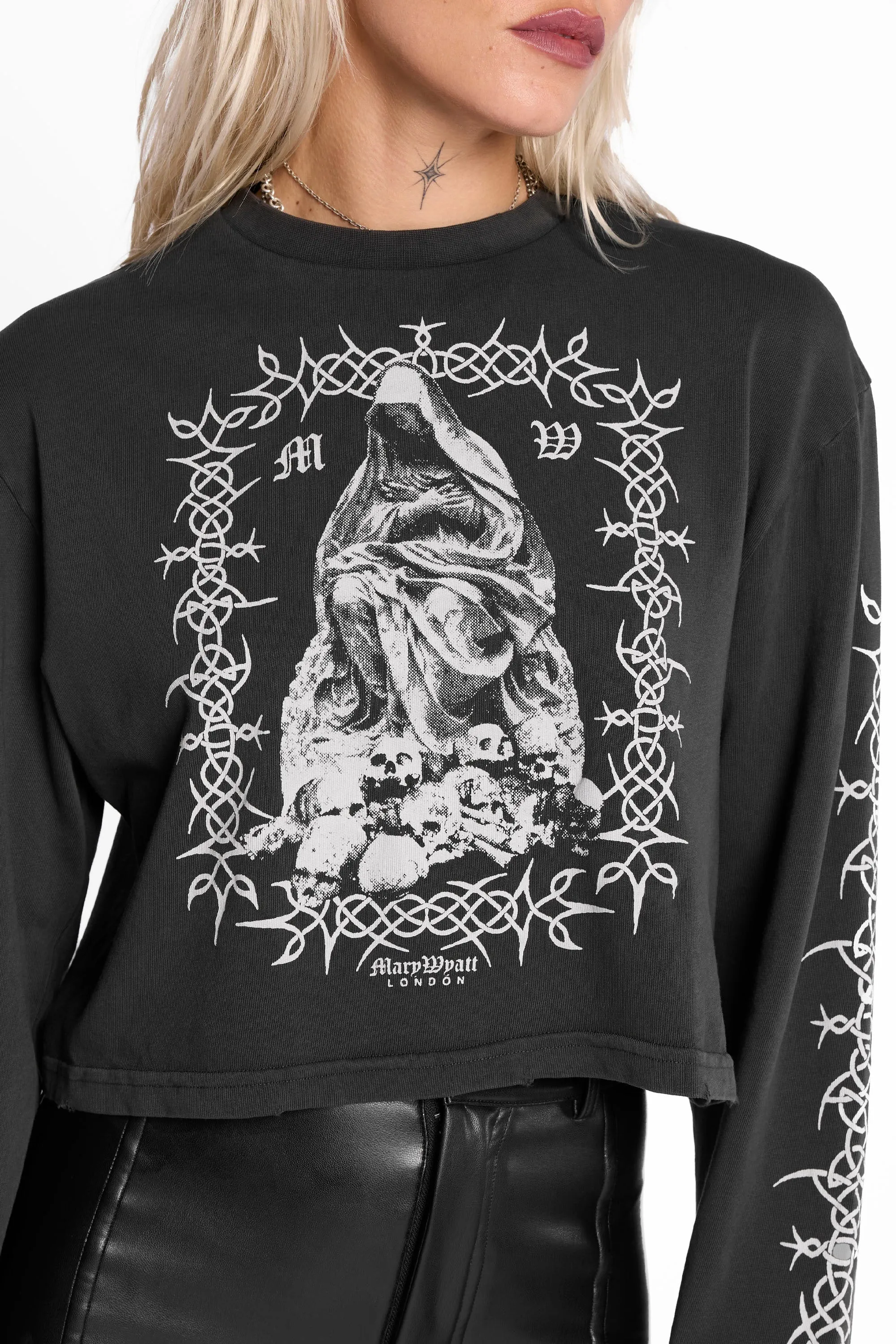 The Sanctum tee features a melancholy martyr atop a pile of skulls, complete with a gnarly border that also embellishes both sleeves.