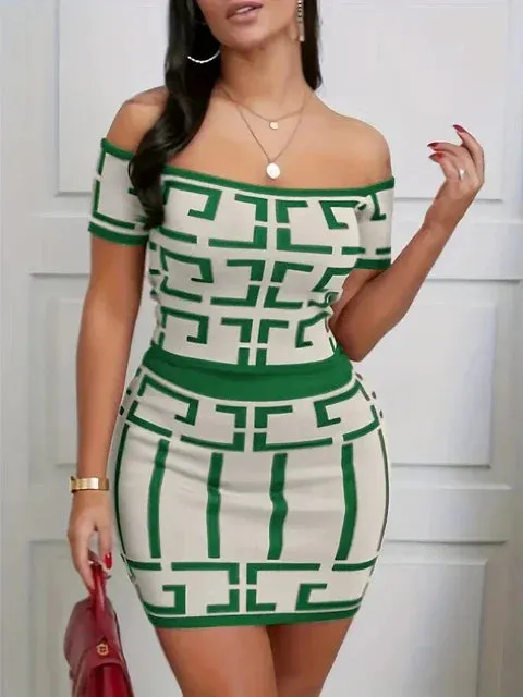 Sexy Geometric Print Two-piece Off Shoulder Top Slim Skirt