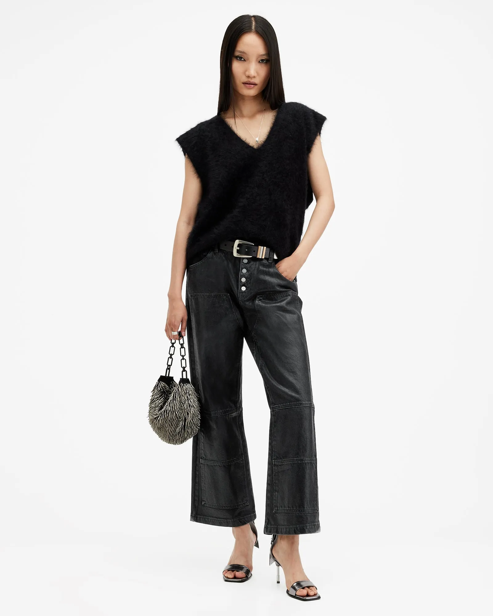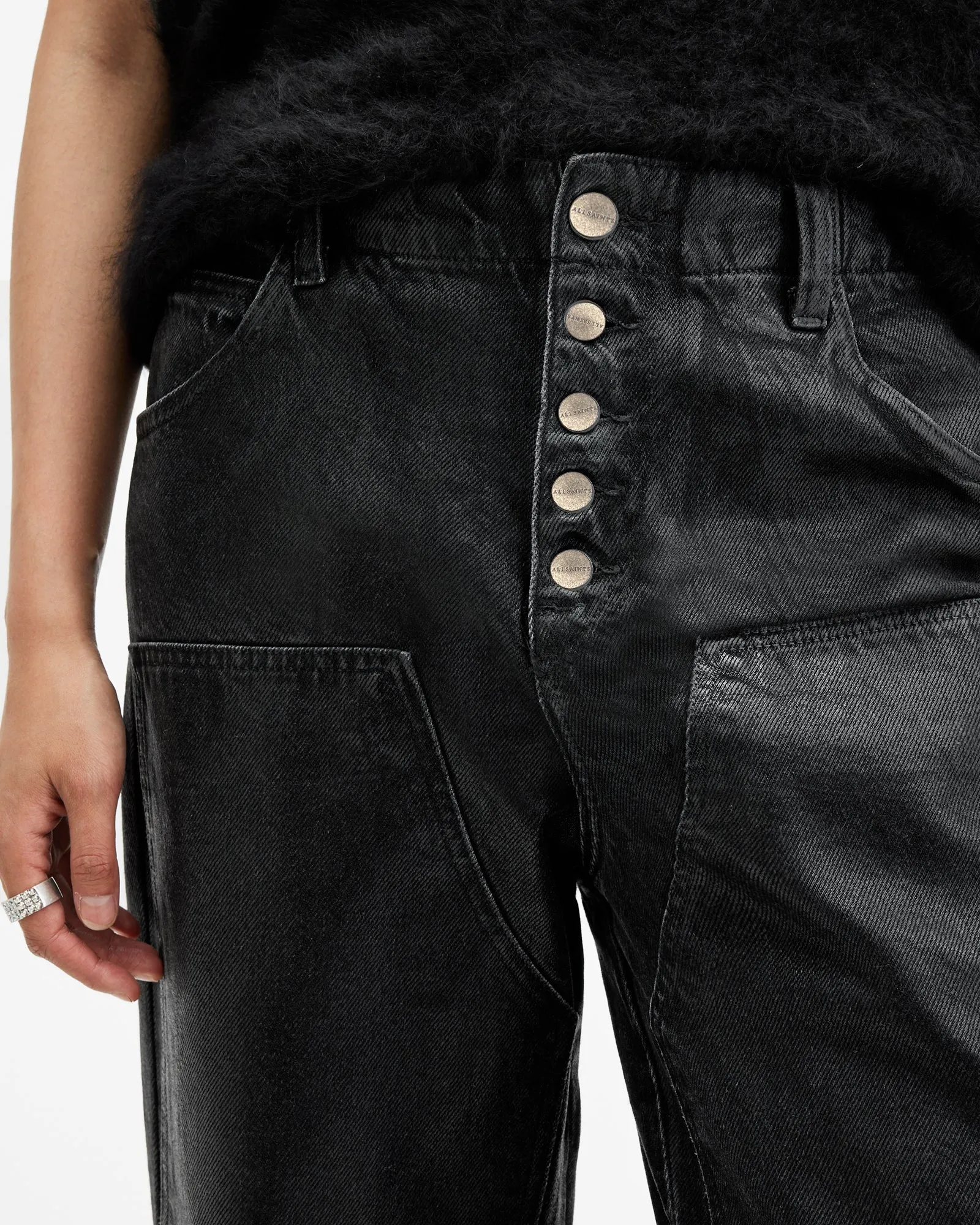 These ones are pretty cool. Introducing the Tay Carpenter Jeans. A new wide-leg style with a slight crop, they feature unique carpenter seam detailing and an exposed button fly. They're crafted from organic cotton that's been coated, sitting mid-rise and with a classic five-pocket construction. Tuck in a tee and throw on an oversized leather jacket, it's an effortless combination.