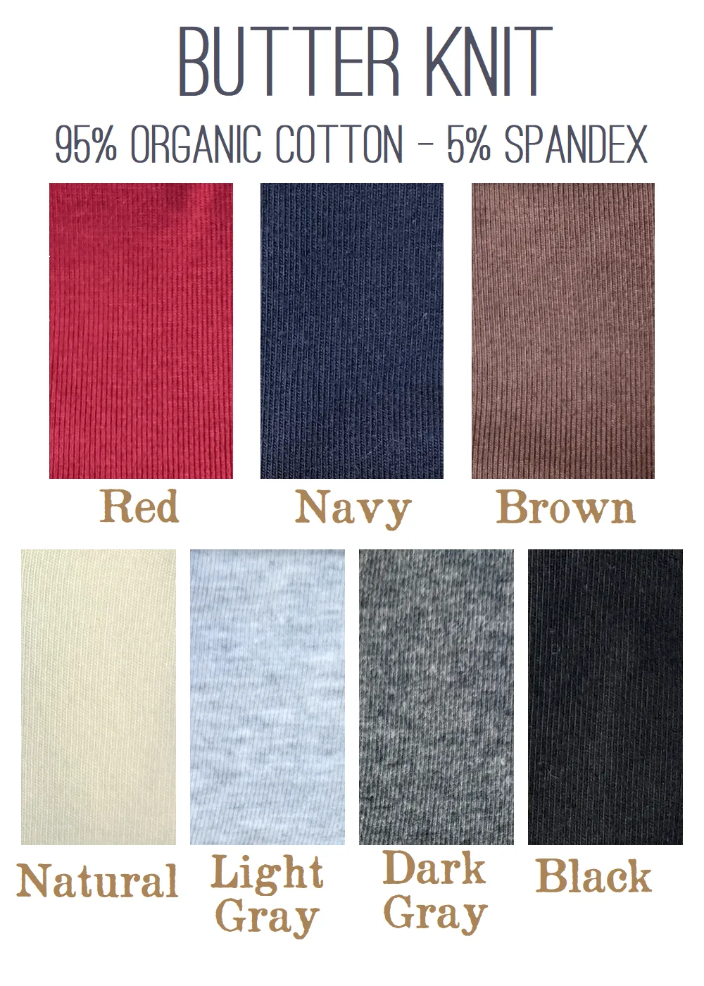 Made from Organic Cotton Butter Knit (95% Organic Cotton, 5% spandex). This fabric is super soft, very stretchy, breathable, and lightweight but not too thin. to learn more about this fabric, or order samples.